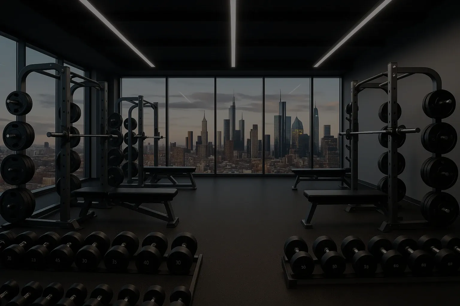 Bancos, mancuernas, racks, barras y piso caucho, complementos esenciales para la operación.